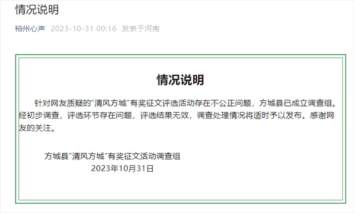·獲獎征文12篇為同一作者,官方通報調查結果:評選環(huán)節(jié)存在問題,評選結果無效。