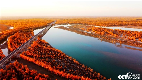2023年10月30日,新疆阿克蘇地區(qū)沙雅縣境內,落日余暉下的哈德墩大橋、金色胡楊和塔里木河交相輝映,美不勝收。