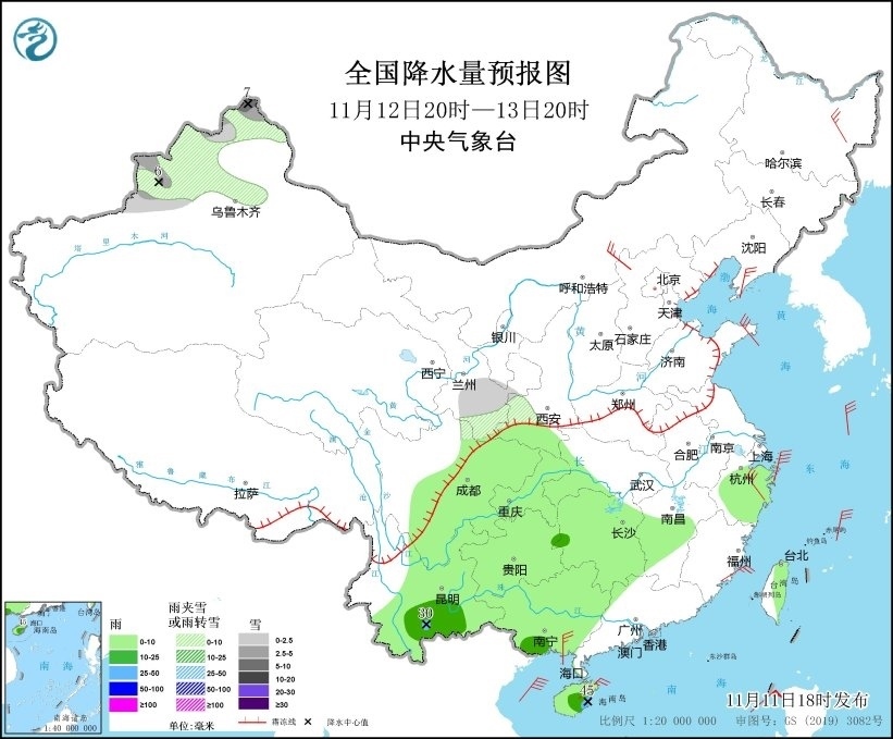 圖4 全國降水量預(yù)報圖(11月11日20時-12日20時)