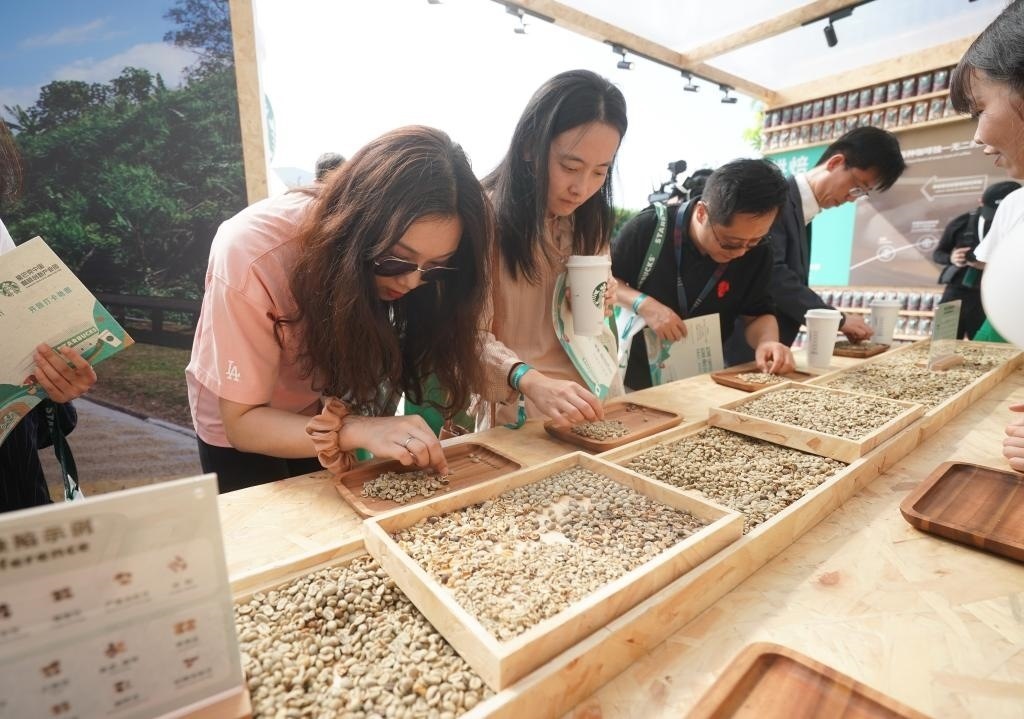 9月19日,在星巴克中國咖啡創(chuàng)新產(chǎn)業(yè)園開園儀式現(xiàn)場,來賓在體驗挑揀咖啡生豆。當日,星巴克中國咖啡創(chuàng)新產(chǎn)業(yè)園在江蘇昆山落成投產(chǎn)。