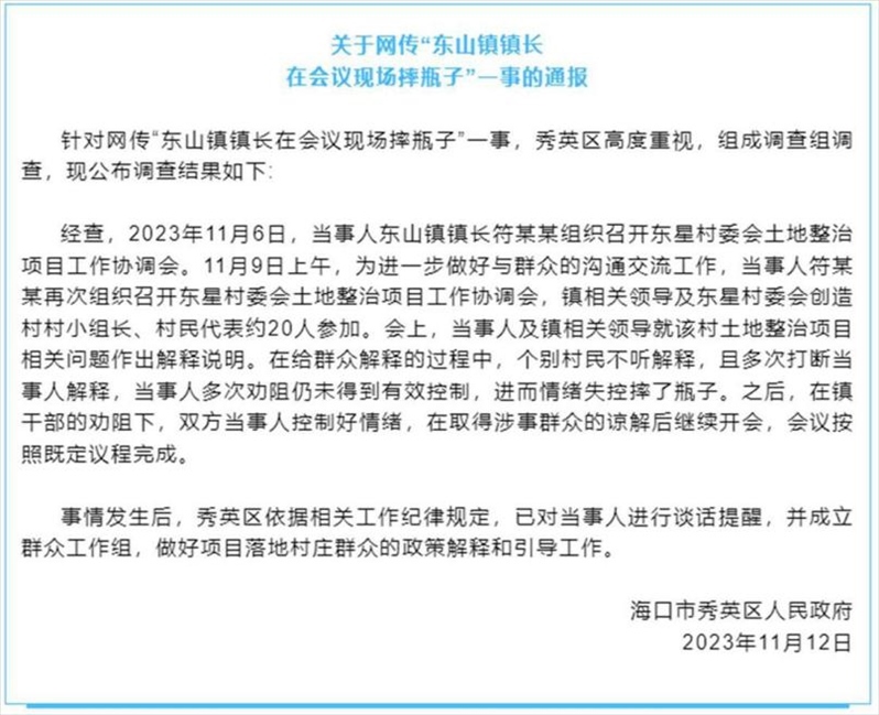 ·??谛阌^(qū)通報(bào)“東山鎮(zhèn)鎮(zhèn)長在會議現(xiàn)場摔瓶子”:已對當(dāng)事人進(jìn)行談話提醒。