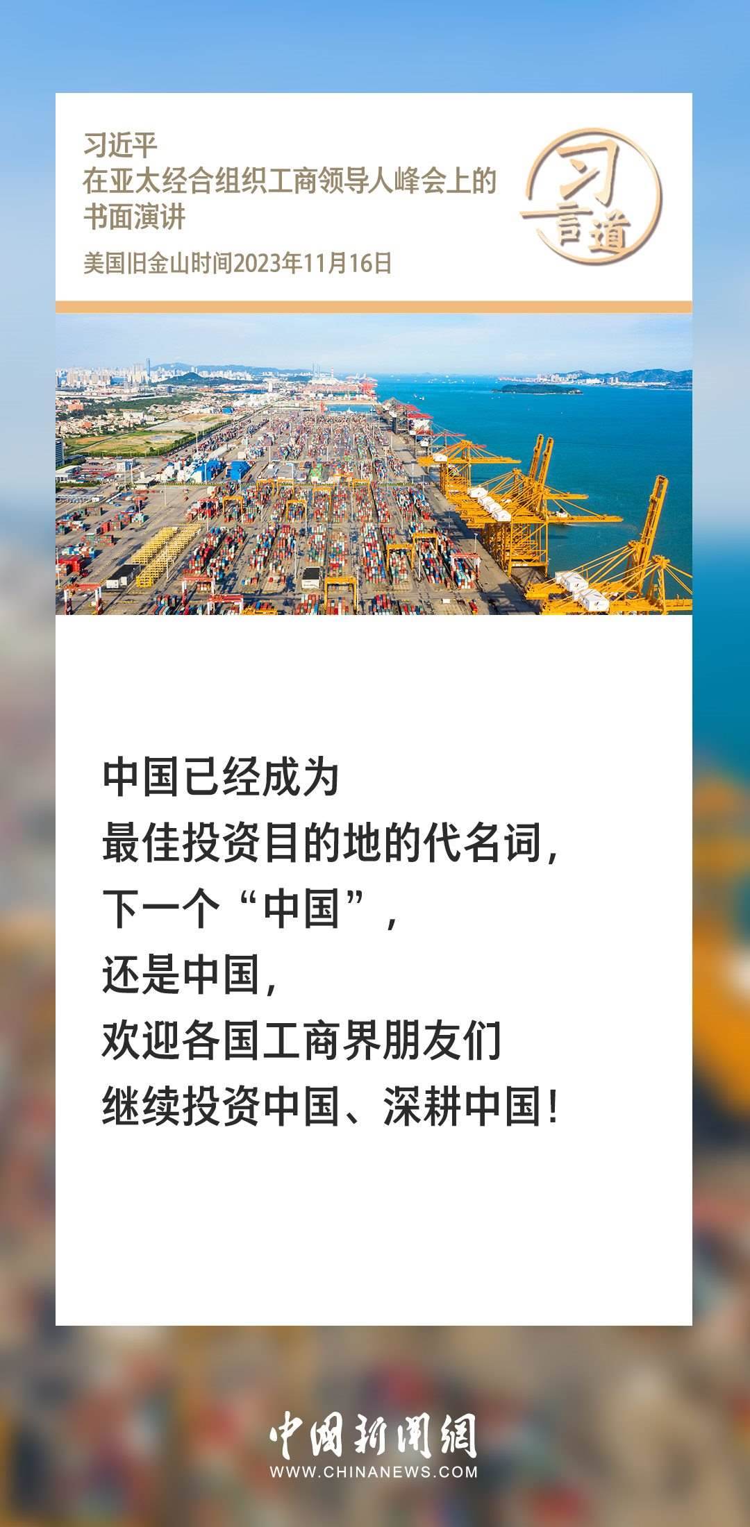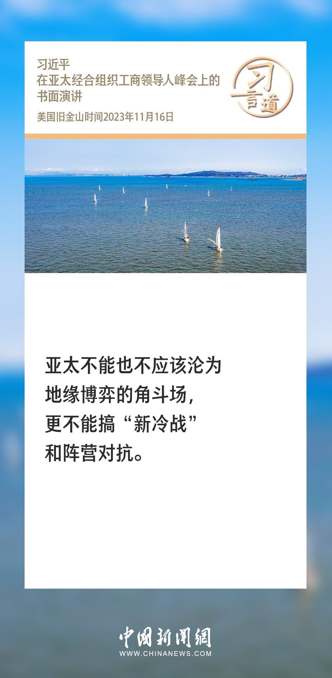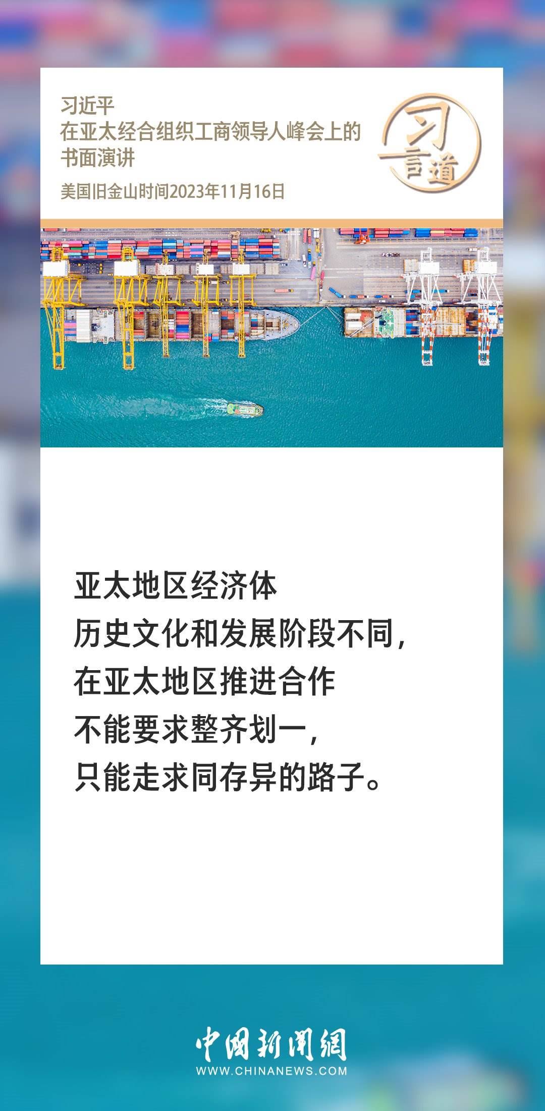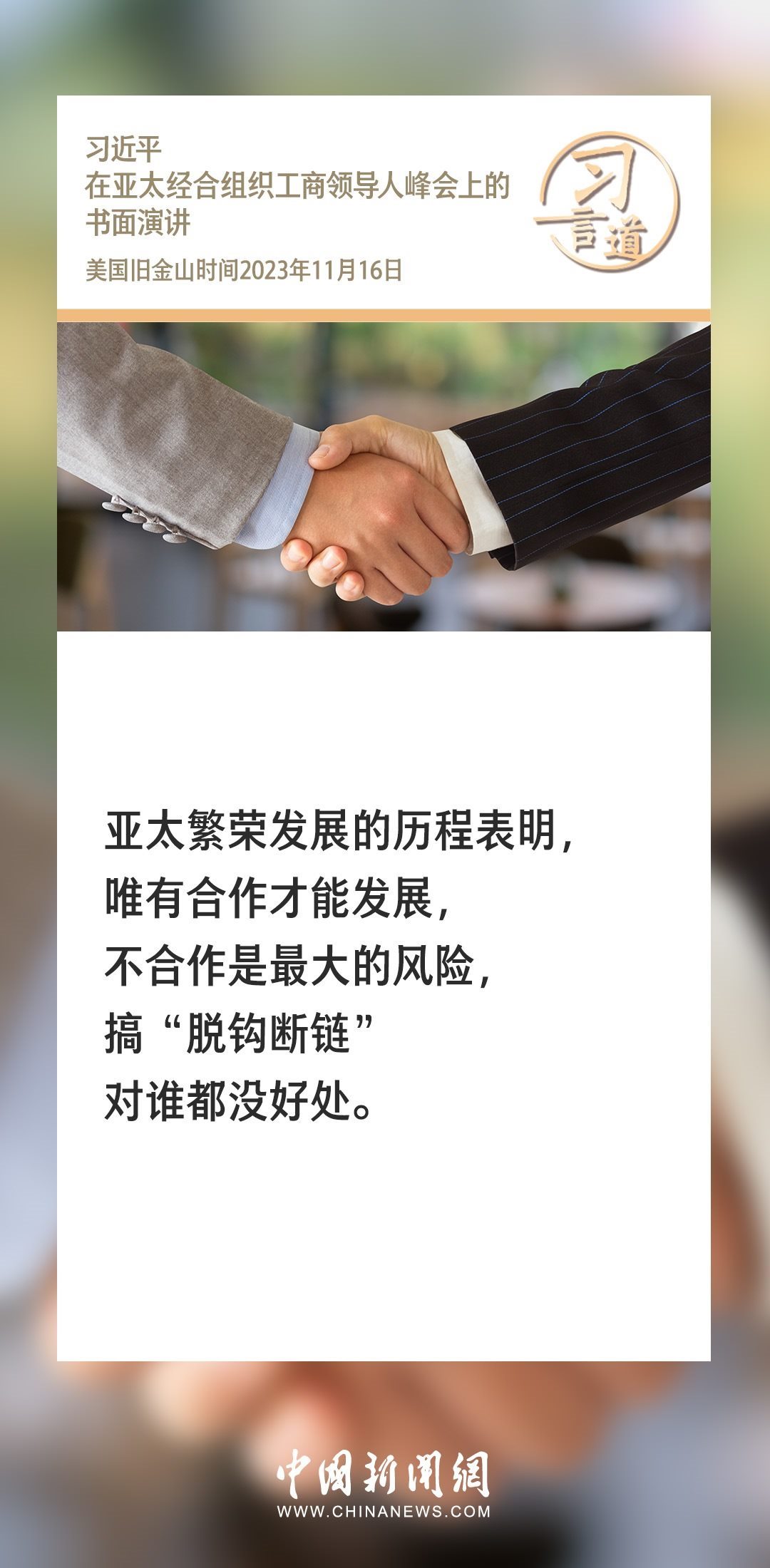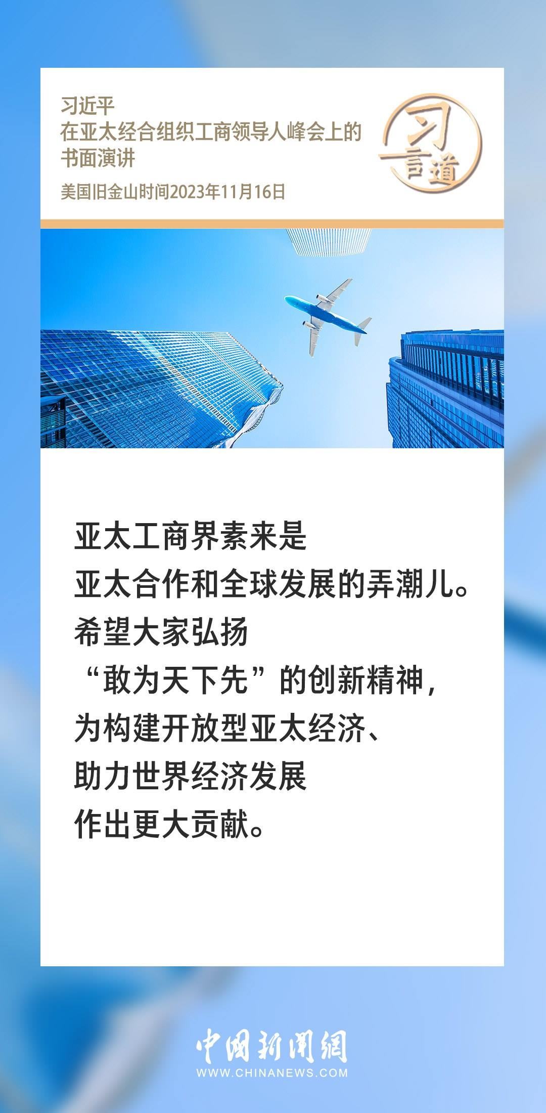 當(dāng)?shù)貢r(shí)間11月16日上午,國家主席習(xí)近平向在舊金山舉行的亞太經(jīng)合組織工商領(lǐng)導(dǎo)人峰會(huì)發(fā)表題為《同心協(xié)力 共迎挑戰(zhàn) 譜寫亞太合作新篇章》的書面演講。習(xí)近平指出——