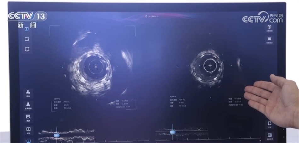 總臺央視記者 褚爾嘉:這里是一個傳統(tǒng)的血管的超聲圖像,我們可以看到血管的全貌。右邊這里是一個工作頻率高達100兆赫茲的超高頻的血管內(nèi)超聲圖像,通過技術(shù)升級,現(xiàn)在我們可以更加清晰地看到冠狀動脈的精細(xì)結(jié)構(gòu),這也是目前世界上清晰度最高的一個血管內(nèi)的超聲圖像。