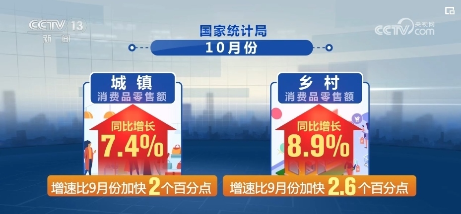 國家統(tǒng)計局最新數(shù)據(jù)顯示,在縣鄉(xiāng)消費(fèi)市場基礎(chǔ)設(shè)施不斷完善、有效供給持續(xù)擴(kuò)大等有利條件帶動下,鄉(xiāng)村市場銷售增速快于城鎮(zhèn)。10月份,城鎮(zhèn)、鄉(xiāng)村消費(fèi)品零售額同比分別增長7.4%和8.9%,增速比9月份分別加快2和2.6個百分點(diǎn)。