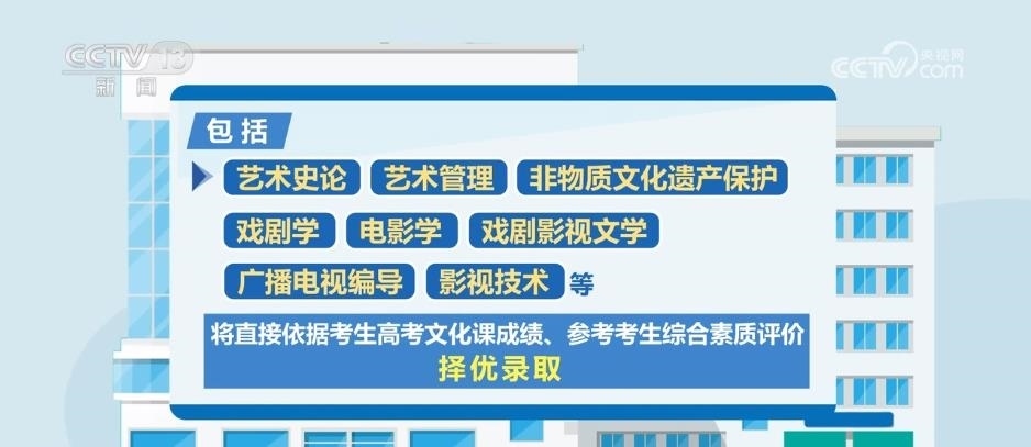 據了解,藝術類專業(yè)依據考生高考文化成績、專業(yè)考試成績,參考綜合素質評價進行招生錄取。此次藝考改革一個重要的變化是,部分藝術類專業(yè)不再組織專業(yè)考試,包括藝術史論、藝術管理、非物質文化遺產保護、戲劇學、電影學、戲劇影視文學、廣播電視編導、影視技術等,將直接依據考生高考文化課成績、參考考生綜合素質評價,擇優(yōu)錄取。