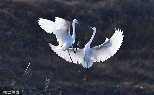 山東滕州,白鷺在荊河水域飛舞、嬉戲。