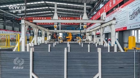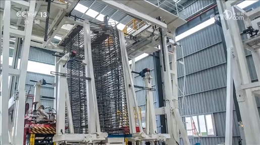 中交二航局常泰長江大橋項目部常務(wù)副經(jīng)理王輝:“傳統(tǒng)的橋塔鋼筋怎么做呢?通過吊機把鋼筋吊到塔上,作業(yè)工人一根根把鋼筋綁起來,個人能力有差別,質(zhì)量和精度,鋼筋間距也很難控制,現(xiàn)在我們采用什么理念呢?就是部品的理念,把塔的鋼筋在下面做成一塊一塊的,就像搭積木一樣,大型吊機把它吊上去,然后一節(jié)節(jié)堆起來。”