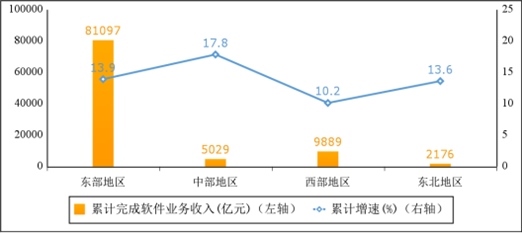 西部地區(qū)軟件業(yè)務(wù)收入小幅提升,中部地區(qū)增勢(shì)突出。1—10月份,東部地區(qū)完成軟件業(yè)務(wù)收入81097億元,同比增長(zhǎng)13.9%,增速較前三季度回落0.2個(gè)百分點(diǎn);中部地區(qū)完成軟件業(yè)務(wù)收入5029億元,同比增長(zhǎng)17.8%,增速較前三季度提高5.7個(gè)百分點(diǎn);西部地區(qū)完成軟件業(yè)務(wù)收入9889億元,同比增長(zhǎng)10.2%,增速較前三季度提高0.3個(gè)百分點(diǎn);東北地區(qū)完成軟件業(yè)務(wù)收入2176億元,同比增長(zhǎng)13.6%,增速與前三季度持平。四個(gè)地區(qū)軟件業(yè)務(wù)收入在全國(guó)總收入中的占比分別為82.6%、5.1%、10.1%和2.2%。