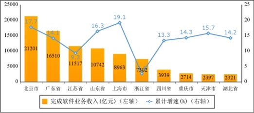 主要軟件大省收入占比持續(xù)提升。1—10月份,軟件業(yè)務(wù)收入居前5名的省份中,北京市、廣東省、江蘇省、山東省、上海市軟件收入分別為21201億元、16510億元、11517億元、10742億元和8963億元,分別增長(zhǎng)17.7%、14.1%、9.3%、16.3%和19.1%,五省(市)合計(jì)軟件業(yè)務(wù)收入68933億元,占全國(guó)比重為70.2%,占比較去年同期提高1個(gè)百分點(diǎn)。