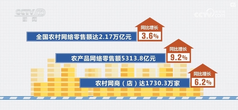 全國農(nóng)村網(wǎng)絡零售額達2.17萬億元,同比增長3.6%;農(nóng)產(chǎn)品網(wǎng)絡零售額5313.8億元,同比增長9.2%;農(nóng)村網(wǎng)商(店)達1730.3萬家,同比增長6.2%。