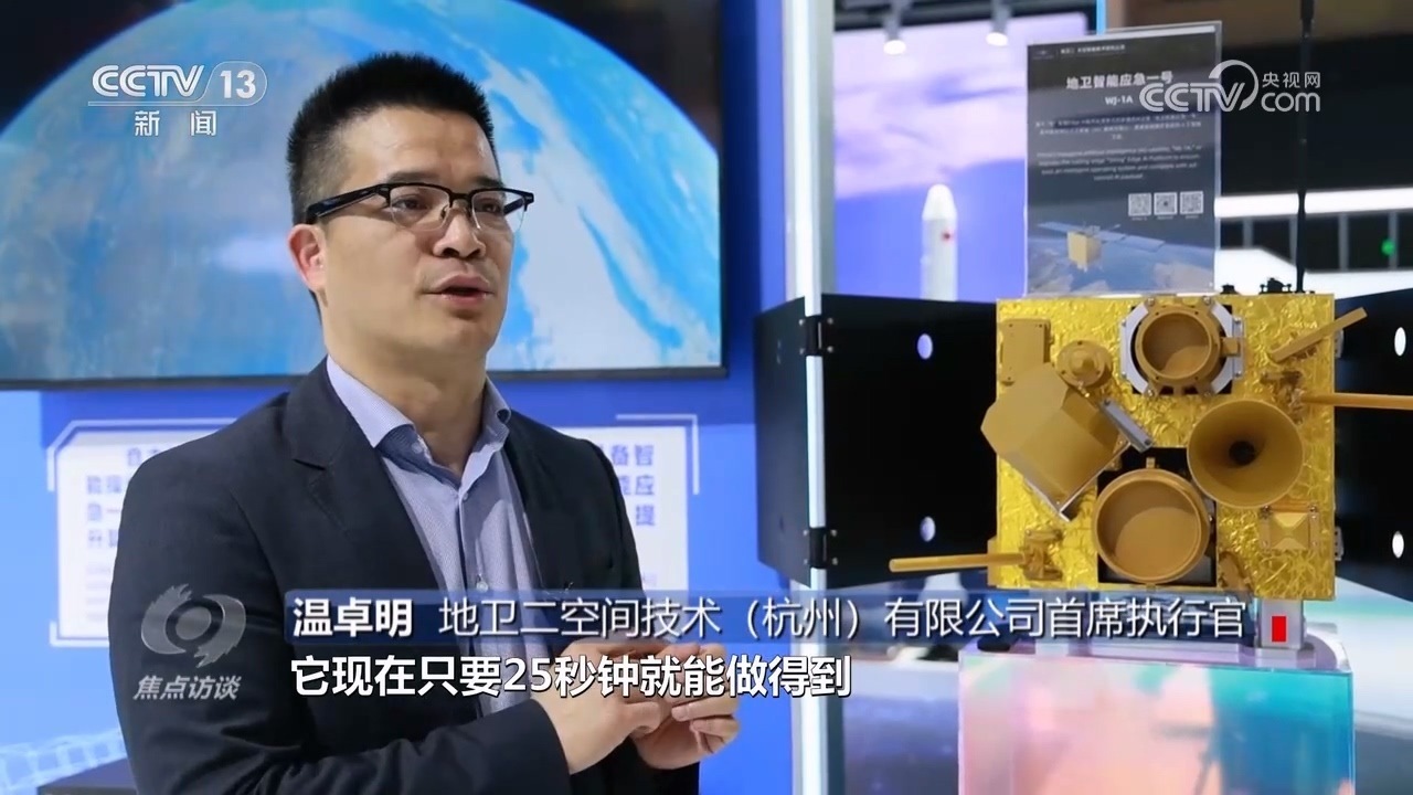 地衛(wèi)二空間技術(shù)(杭州)有限公司首席執(zhí)行官溫卓明:“這是一個(gè)聰明的衛(wèi)星,傳統(tǒng)的衛(wèi)星6個(gè)小時(shí)才能干完的事情,它只要25秒鐘就能做得到,而且原來可能要5000個(gè)工程師干的活,現(xiàn)在1個(gè)小時(shí)它就能做完。它是怎么能做到的?因?yàn)槲覀儼讶斯ぶ悄芊诺搅颂?。?/p>
