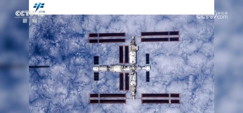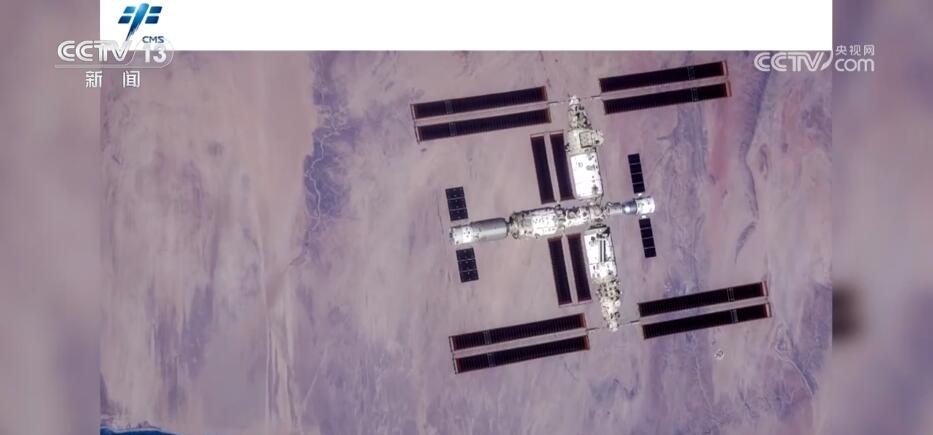 在繞飛至空間站正上方600米點位后,神舟十六號航天員乘組利用手持高清相機,進行了以地球為背景的空間站組合體全景圖像拍攝。