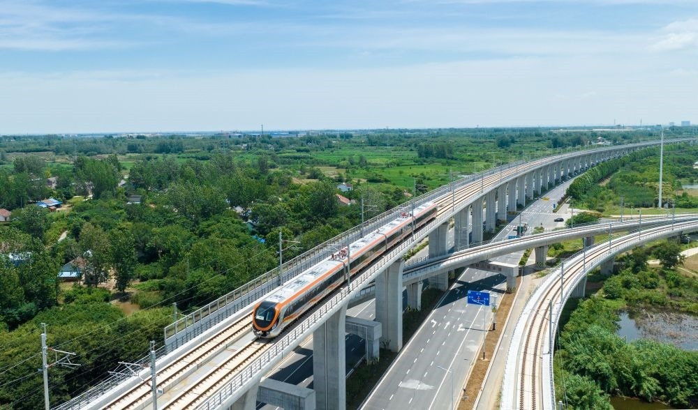這是在安徽省滁州市來安縣境內(nèi)拍攝的滁寧城際鐵路列車(2023年6月28日攝,無人機照片)。當(dāng)日,滁寧城際鐵路滁州段開通運營。滁寧城際鐵路西起滁州高鐵站,止于正在規(guī)劃建設(shè)中的南京北站,全長約55公里。