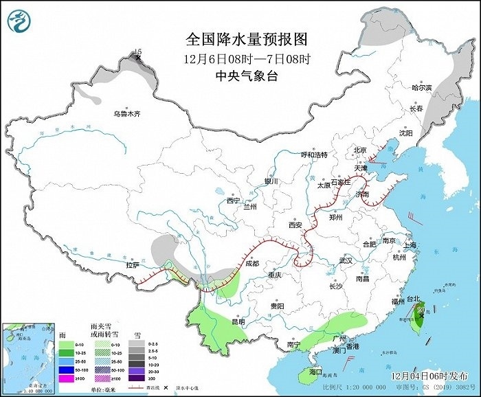 12月6日08時至7日08時,新疆北疆北部、內(nèi)蒙古東北部、黑龍江西北部和東部、吉林東部、西藏東部等地部分地區(qū)有小雪或雨夾雪,其中,新疆阿勒泰山區(qū)等地部分地區(qū)有中雪到大雪,局地暴雪(10~15毫米)。云南中西部、廣西東部、廣東北部、海南島、臺灣島等地部分地區(qū)有小雨,其中,臺灣島的部分地區(qū)有中雨(10~20毫米)(見圖3)。