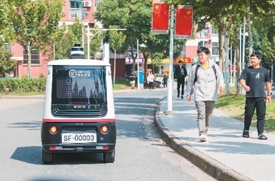 在浙江省金華職業(yè)技術學院的校園里,一輛無人快遞車在配送快遞。胡肖飛攝(人民圖片)