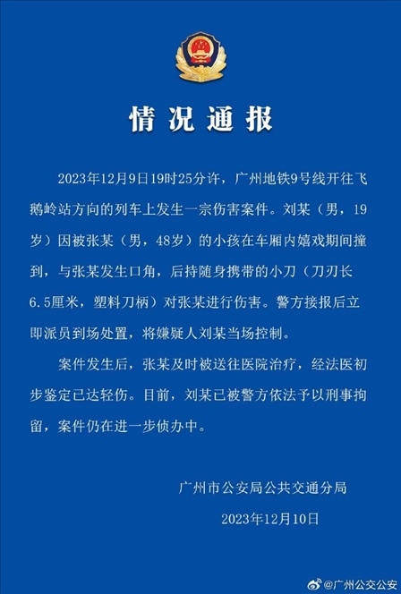 ·警方通報(bào)“廣州地鐵9號(hào)線(xiàn)持刀傷人事件”,廣州地鐵回應(yīng):涉案刀具不在管制范圍內(nèi)。
