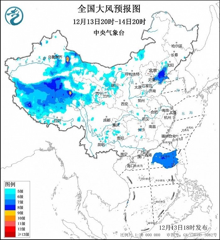 預(yù)計(jì),12月13日20時(shí)至14日20時(shí),新疆東部和南疆盆地、內(nèi)蒙古中西部、寧夏、西藏西部、青海等地部分地區(qū)有5~6級(jí)、陣風(fēng)7~8級(jí)的大風(fēng),其中,新疆山口地區(qū)、青海西部、西藏西北部等地部分地區(qū)有7~9級(jí)、陣風(fēng)10~11級(jí)的大風(fēng);渤海、南海東北部部分海域?qū)⒂?~8級(jí)、陣風(fēng)9級(jí)的大風(fēng)。