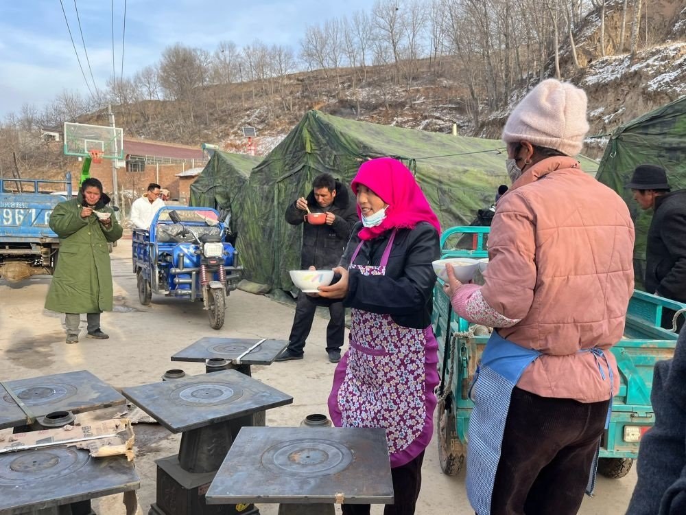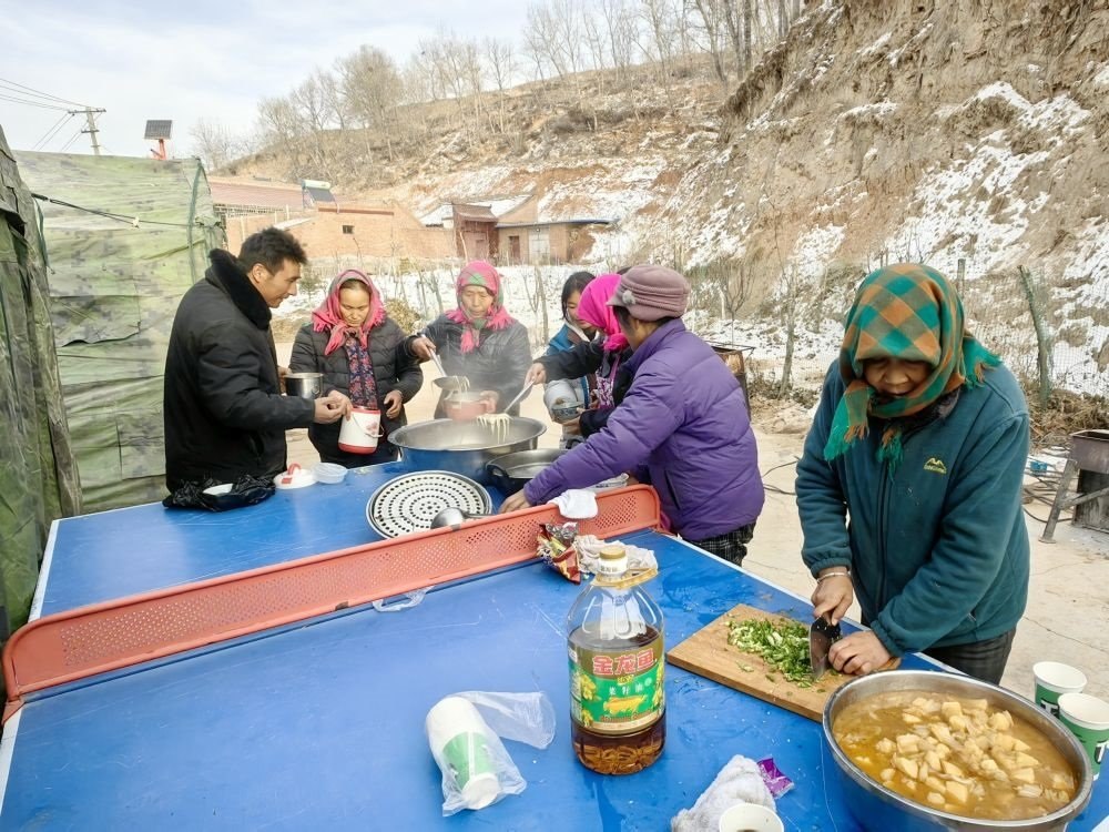 循聲望去,炊煙升起。包著粉紅頭巾的婦女們端出一碗碗熱氣騰騰的搟面條。連吃幾頓方便食品的村民,終于吃上了家常飯!