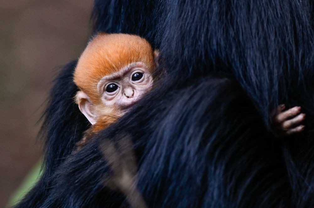 在貴州麻陽(yáng)河國(guó)家級(jí)自然保護(hù)區(qū)拍攝的黑葉猴幼猴(4月30日攝)。新出生的黑葉猴毛色呈金黃色,幾個(gè)月后逐漸變成黑色。