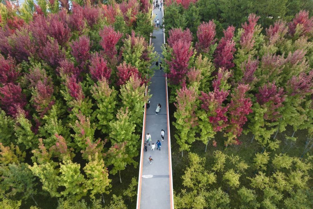 10月7日,市民在陜西西安雁南公園內(nèi)駐足觀景(無(wú)人機(jī)照片)。
