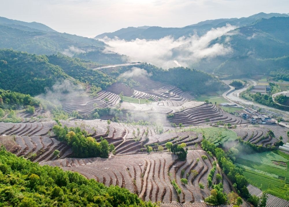 陜西省漢中市略陽(yáng)縣郭鎮(zhèn)譚家莊村綜合治理后的梯田(4月26日攝,無(wú)人機(jī)照片)。