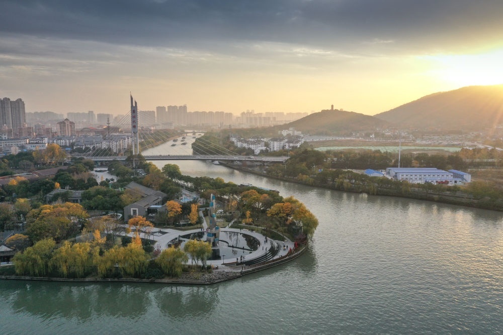 江蘇無(wú)錫運(yùn)河主航道與運(yùn)河公園景色(無(wú)人機(jī)照片,12月9日攝)。