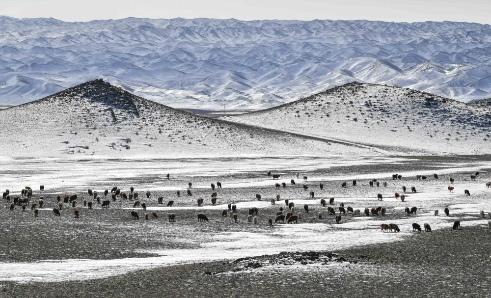 羊群在新疆裕民縣巴爾魯克山南坡的冬牧場(chǎng)上覓食(2月10日攝)。