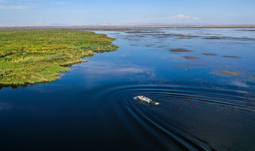 9月15日,在內(nèi)蒙古烏梁素海湖面上,河湖濕地水環(huán)境保護(hù)與修復(fù)技術(shù)研究團(tuán)隊(duì)成員乘坐快艇去采集湖水樣本(無(wú)人機(jī)照片)。
