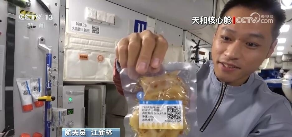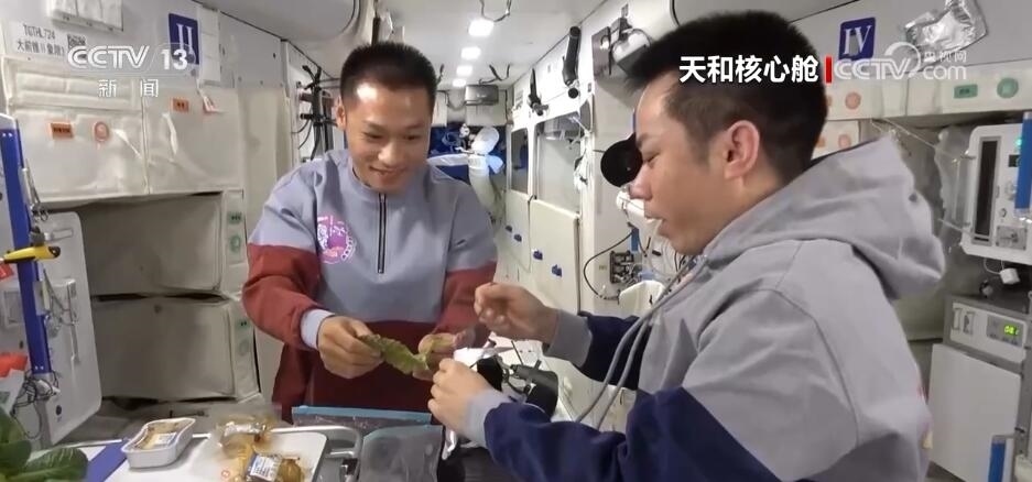 航天員 江新林:我是今天的太空美食家,讓我?guī)ьI(lǐng)大家一起來探索發(fā)現(xiàn)今天的太空美食。我們先看一下主食,熱乎乎的,看看里面都有什么吧,有01最愛吃的白米飯,小心燙哦,02愛吃的面條,我的炒飯。好了,把它粘在餐桌上。然后再讓我們看看我為他們準(zhǔn)備的驚喜??纯催@是什么?這是我們冬至特意結(jié)余的餃子,還有蔬菜副食。地面上的工作人員考慮得特別周到,按照個(gè)人的口味為我們準(zhǔn)備了美味的食品,而且將它們塑封包裝,給我們節(jié)余時(shí)間的時(shí)候又保證它的口味。這是網(wǎng)紅太空香粽,大家印象比較深刻吧,還有這個(gè)年糕也是特別好吃、特別美味,還有紅燴豬排,保證有足夠的蛋白質(zhì)攝入量。很豐盛。請(qǐng)看這里,我們特意留了一些新鮮的水果,看看都有什么吧,有美味的蘋果,還有葡萄,大家這個(gè)都特別愛吃,我們?nèi)齻€(gè)在一起分享一下。
