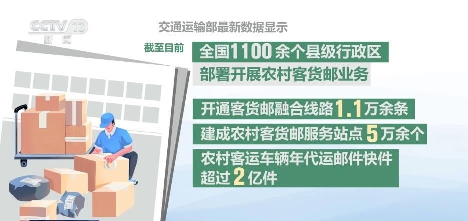 交通運輸部最新數(shù)據(jù)顯示,截至目前,全國1100余個縣級行政區(qū)部署開展農(nóng)村客貨郵業(yè)務(wù),開通客貨郵融合線路1.1萬余條,建成農(nóng)村客貨郵服務(wù)站點5萬余個,農(nóng)村客運車輛年代運郵件快件超過2億件。
