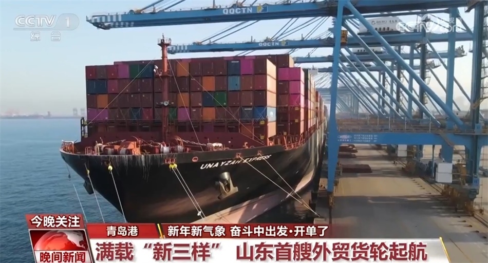 新年伊始,山東首艘外貿(mào)貨輪從青島港起航。3500多個(gè)標(biāo)箱里滿載包括電動(dòng)載人汽車(chē)、鋰離子蓄電池、太陽(yáng)能電池等外貿(mào)“新三樣”,總貨值約2億人民幣。