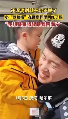 1月5日,從漠河回哈爾濱的雪國列車上,有位“砂糖橘殿下”邊哭邊抱著警察叔叔不撒手,“我想警察叔叔跟我回南寧。”來自東北警察叔叔的愛,一定是最最暖的吧!