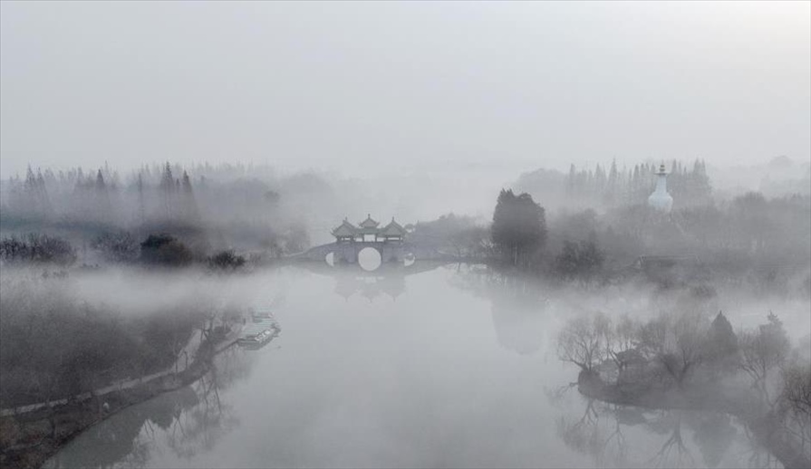 2024年1月6日,江蘇揚州,瘦西湖風景區(qū)在晨霧中若隱若現(xiàn),宛如一幅水墨畫卷,美不勝收。