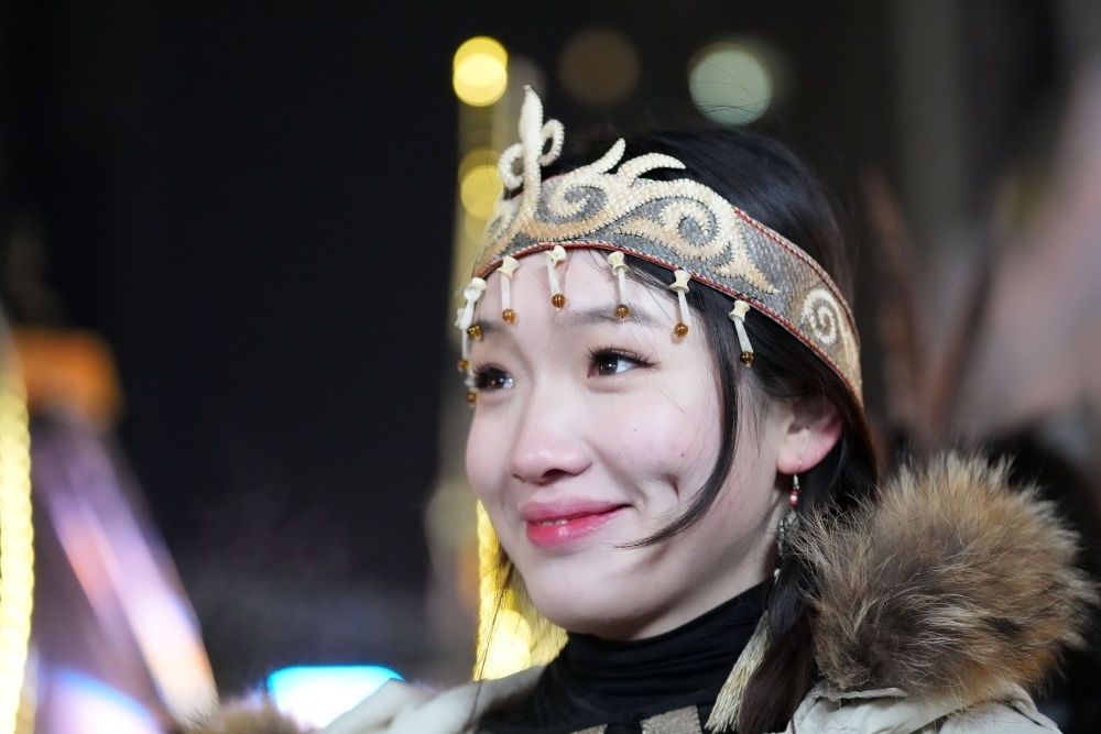 ↑1月6日,戴著魚皮頭飾的赫哲族姑娘在哈爾濱中央大街上參與家鄉(xiāng)推介活動。