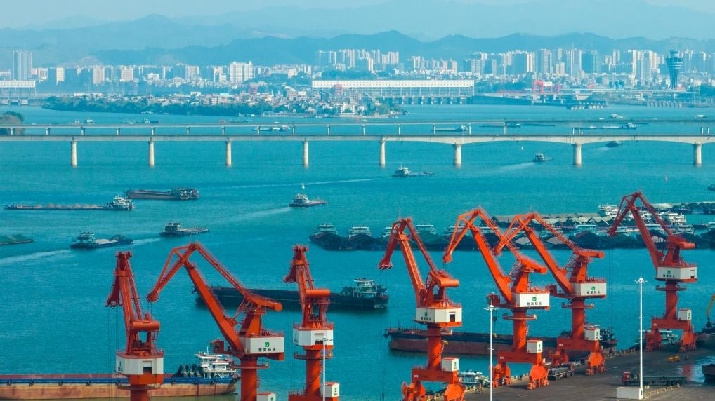 1月3日,在廣西梧州臨港經(jīng)濟區(qū)赤水港碼頭,工人操作設(shè)備在碼頭上進行裝卸作業(yè)(無人機照片)。新華社發(fā)(何華文攝)