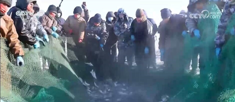 在克什克騰旗達(dá)里湖現(xiàn)場(chǎng),人工鑿冰、冰下走網(wǎng),冬捕隊(duì)員在作業(yè)時(shí)選用5公分網(wǎng)眼,這樣捕魚(yú)時(shí)就能漏掉小魚(yú)。馬拉絞盤(pán)將大網(wǎng)拖拽出網(wǎng)口,滿載魚(yú)兒的漁網(wǎng)慢慢地從湖水中出來(lái),游客們感受豐收的喜悅。