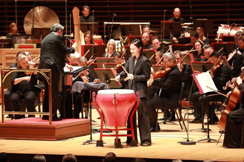 1月12日,在美國(guó)費(fèi)城,上海交響樂(lè)團(tuán)打擊樂(lè)演奏家付藝霏(中)在2024年費(fèi)城交響樂(lè)團(tuán)新春音樂(lè)會(huì)上演出。