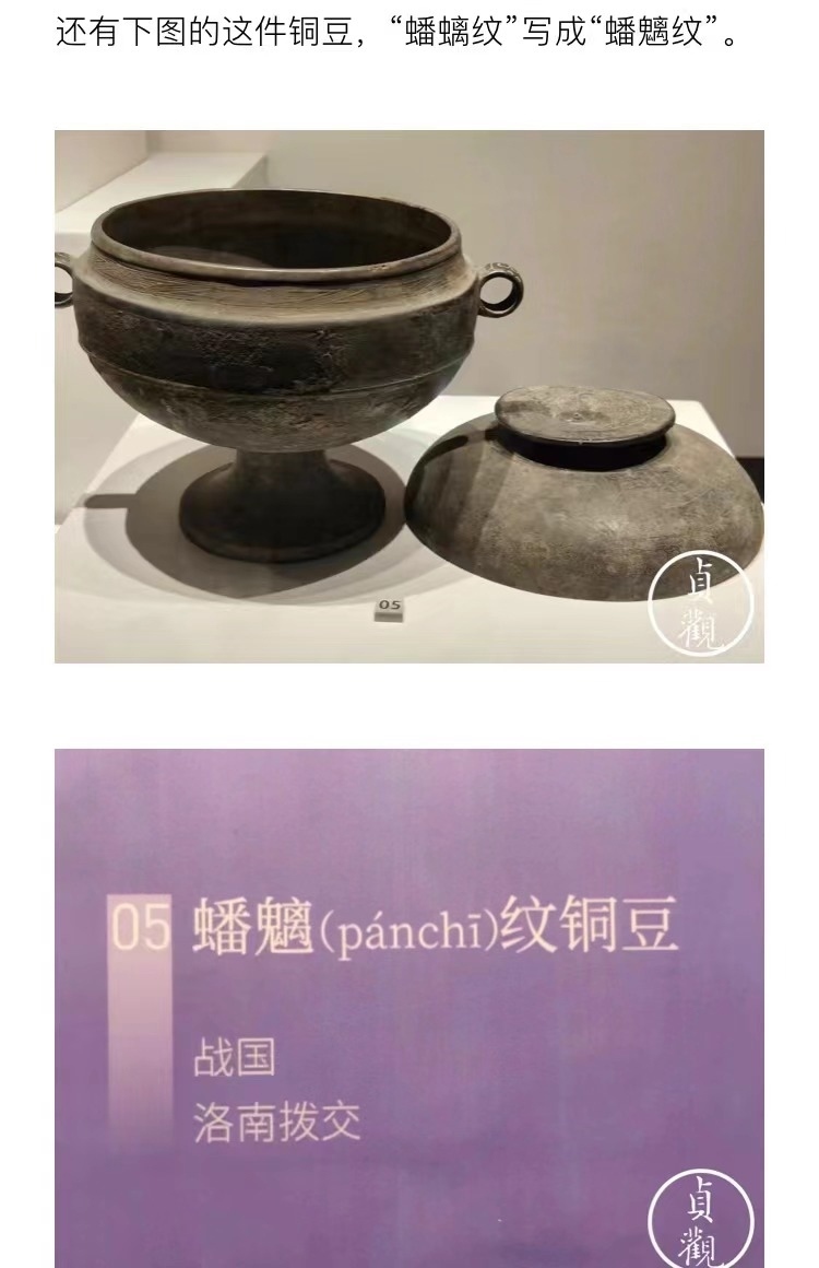文章稱,秦漢館中很多展品不僅沒有英文標(biāo)識,甚至連展品的基本信息都不全,有的文物名稱也被標(biāo)錯,如:“鷹獸相搏紋飾銅牌飾” 被誤寫為“銅鷹獸權(quán)博牌飾”;介紹一件銅豆的展品信息中,“蟠螭紋”誤寫成“蟠魑紋”。