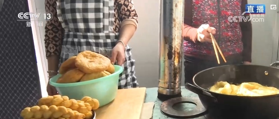 炸年饃是當(dāng)?shù)赝磷迦罕娪哟汗?jié)的傳統(tǒng)習(xí)俗。一家人齊上陣,這邊兩位大姐正在將發(fā)好的面揉好、揪出面劑子、搟成圓形、表面抹上清油,放進(jìn)油鍋里炸熟。對(duì)于土族群眾來說,進(jìn)入臘月之后就開始做年饃、宰年豬、置辦年貨,年味兒就濃了。炸年饃是當(dāng)?shù)厝罕娖碓感碌囊荒觑L(fēng)調(diào)雨順、五谷豐登、平安順?biāo)斓拿篮迷⒁狻V谱髂牮x的面粉、菜籽油等材料都是政府給受災(zāi)群眾提供的物資。