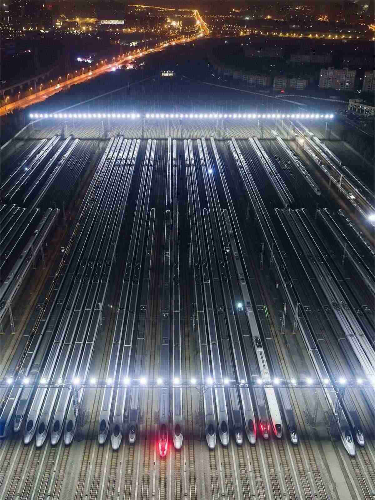 1月26日凌晨1時(shí)許,春運(yùn)前夜,在武漢動(dòng)車段的存車線上,一列列完成檢修的動(dòng)車組集結(jié)完畢,猶如“陸地航母”一般,蓄勢(shì)待發(fā),迎接春運(yùn)。(湖北日?qǐng)?bào)全媒記者 任勇 通訊員 許輝 劉博洋 攝)
