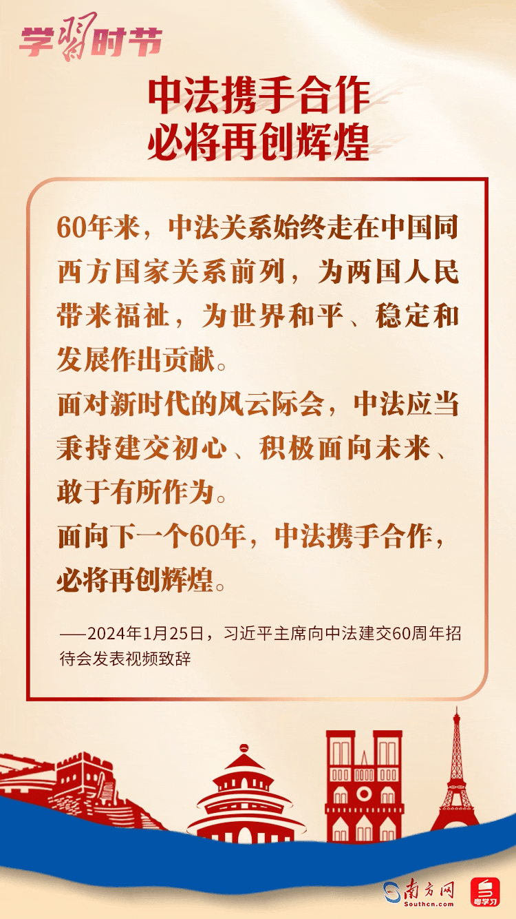 1月27日,國家主席習(xí)近平同法國總統(tǒng)馬克龍互致賀電,慶祝兩國建交60周年。習(xí)近平主席指出,60年前,中法打破冷戰(zhàn)堅冰、跨越陣營鴻溝,建立大使級外交關(guān)系。兩國關(guān)系創(chuàng)造多個“第一”、取得豐碩成果,不僅造福于兩國人民,也為維護(hù)世界和平穩(wěn)定、促進(jìn)世界多極化和國際關(guān)系民主化發(fā)揮重要作用。