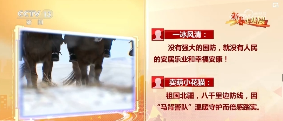 《新春走基層·馬背警隊:風(fēng)雪中的溫暖守護(hù)》播出后,有網(wǎng)友說:“沒有強(qiáng)大的國防,就沒有人民的安居樂業(yè)和幸福安康!”。也有網(wǎng)友說:“祖國北疆,八千里邊防線,因“馬背警隊”溫暖守護(hù)而倍感踏實。”