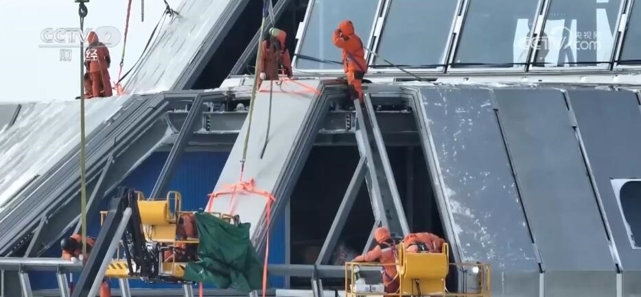 800多斤的幕墻板在大風(fēng)的作用下,就像飄在空中的樹葉,非常難以控制。此時,現(xiàn)場的風(fēng)力已經(jīng)增加到了8級,氣溫驟降。40分鐘之后,在現(xiàn)場所有隊員的配合下,第一塊板終于穩(wěn)穩(wěn)的就位了。緊接著是第二塊、第三塊。盡管已經(jīng)在風(fēng)雪中奮戰(zhàn)了十幾個小時,但大家的臉上依然掛滿了微笑。凌晨12點半,最后一塊板終于順利安裝到位,新站迎風(fēng)面實現(xiàn)了全封閉,大家也終于放心了。