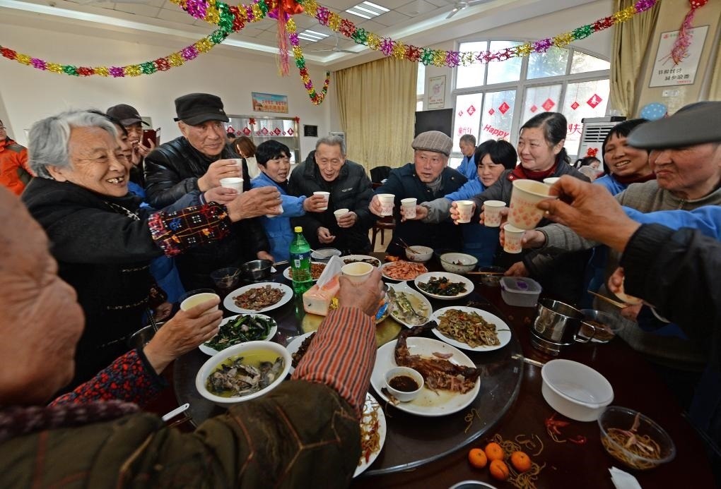 2016年2月7日,江西南昌一福利院里的老人們與護(hù)理員一起吃年夜飯。