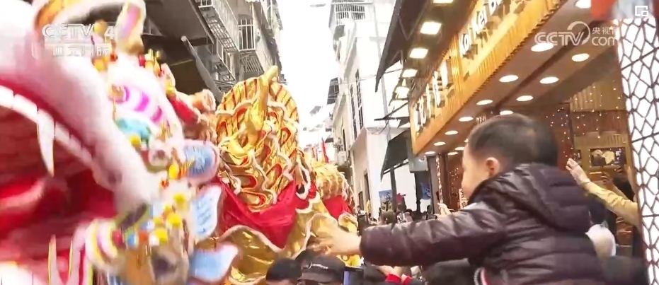農(nóng)歷春節(jié)大年初一,澳門特區(qū)政府旅游局舉辦“歡樂春節(jié)——2024年龍騰舞躍賀新春”社區(qū)巡演活動。238米長的大金龍和18頭醒獅,穿越澳門大街小巷和主要景區(qū),市民和游客紛紛伸手觸摸金龍和醒獅,迎春納福。