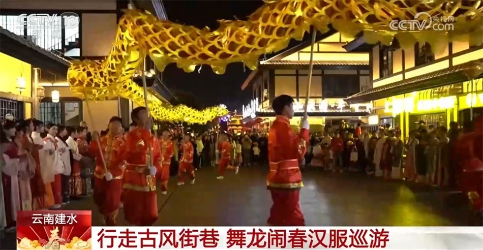 在云南紅河州建水縣紫陶里漢唐街區(qū),一場(chǎng)舞龍鬧春漢服巡游活動(dòng)拉開了序幕。舞龍隊(duì)伍一路閃轉(zhuǎn)騰挪,一條黃色長(zhǎng)龍奮力舞動(dòng),忽高忽低,飄忽飛逸。身著華美漢服的姑娘行走在古風(fēng)街巷間,一種古樸幽遠(yuǎn)的韻味撲面而來(lái)。市民與游客在感受建水年味的同時(shí),也體驗(yàn)到中華傳統(tǒng)文化之美。