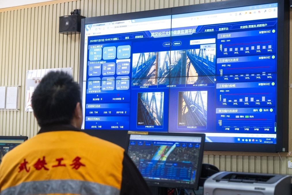 進(jìn)入高鐵時(shí)代,隨著技術(shù)的發(fā)展與進(jìn)步,大橋養(yǎng)修標(biāo)準(zhǔn)提升,養(yǎng)護(hù)水平不斷提高。在武漢長江大橋橋梁車間辦公樓一樓的主控室,大屏上顯示著大橋數(shù)十處關(guān)鍵處所監(jiān)控畫面,大橋上橋梁防撞監(jiān)控系統(tǒng)和橋梁健康監(jiān)測系統(tǒng)的各項(xiàng)數(shù)據(jù)實(shí)時(shí)更新。