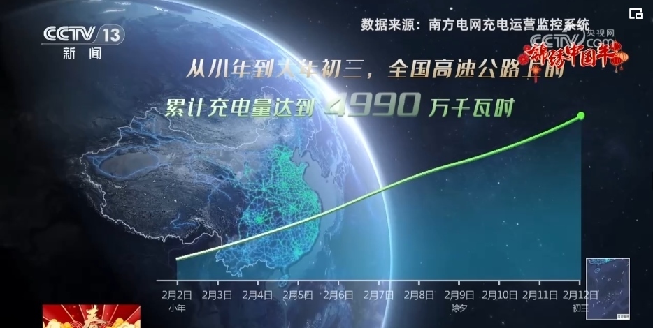 這個春節(jié),人們駕駛著新能源汽車,繪制出了一幅“綠色”的春節(jié)旅行軌跡圖。2.1萬個充電樁遍布各地的高速公路,從小年到大年初三,全國高速公路上的累計充電量達(dá)到4990萬千瓦時。