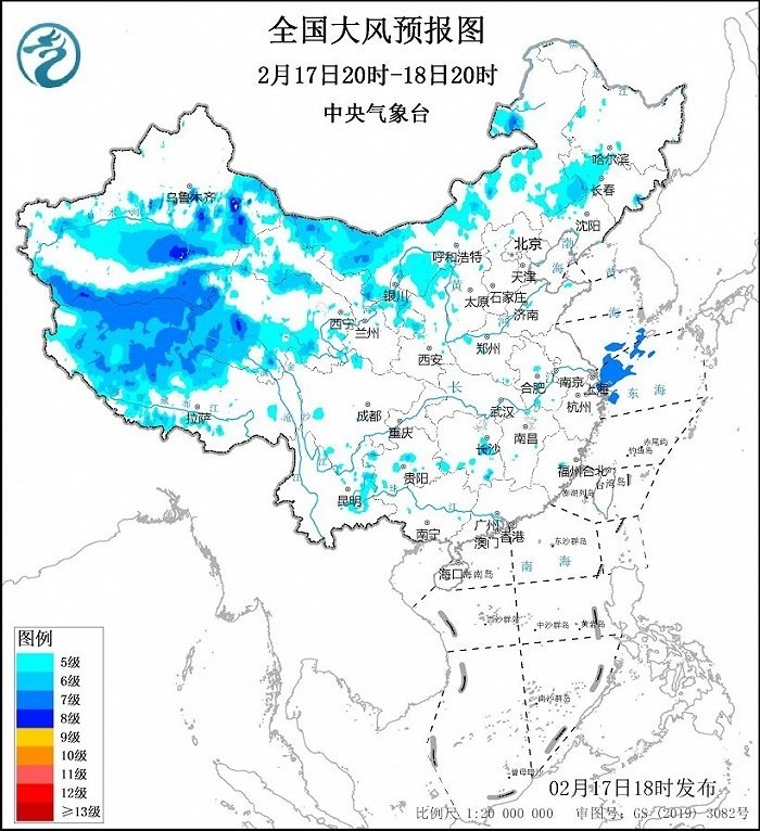 中央氣象臺(tái)2月17日18時(shí)繼續(xù)發(fā)布大風(fēng)藍(lán)色預(yù)警