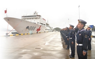 執(zhí)行“和諧使命—2022”任務(wù)的中國(guó)海軍“和平方舟”號(hào)醫(yī)院船返回浙江舟山某軍港,任務(wù)部隊(duì)官兵代表在碼頭迎接。“和平方舟”號(hào)醫(yī)院船是我國(guó)自主設(shè)計(jì)建造的首艘制式遠(yuǎn)洋醫(yī)院船。自2008年入列以來(lái),該船以“和諧使命”任務(wù)為主要載體,多次遠(yuǎn)赴海外開(kāi)展人道主義醫(yī)療服務(wù)。孫 飛攝(新華社發(fā))